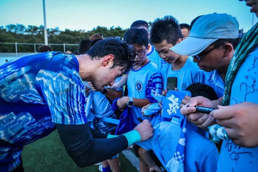 ▲球队不定期举行球迷开放日活动,邀请球迷走进球队训练基地观看训练,与球员互动。图为深圳新鹏城球员彭鹏在为球迷签名。